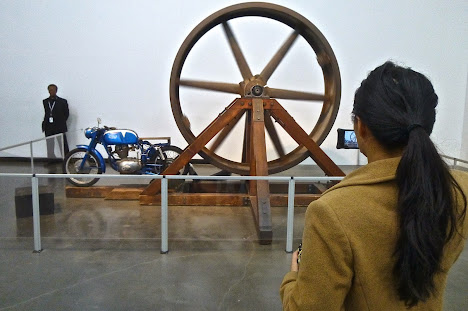 Other installations play with the rule of mechanics and thermodynamics. You can see for instance a motorcycle which is connected with a large and heavy cast-iron flywheel. They let the machine run with highest speed for some minutes which sets the connected wheel spinning. Then they turn the machine off and the wheel continues to spin for hours by itself thanks to the stored kinetic energy.