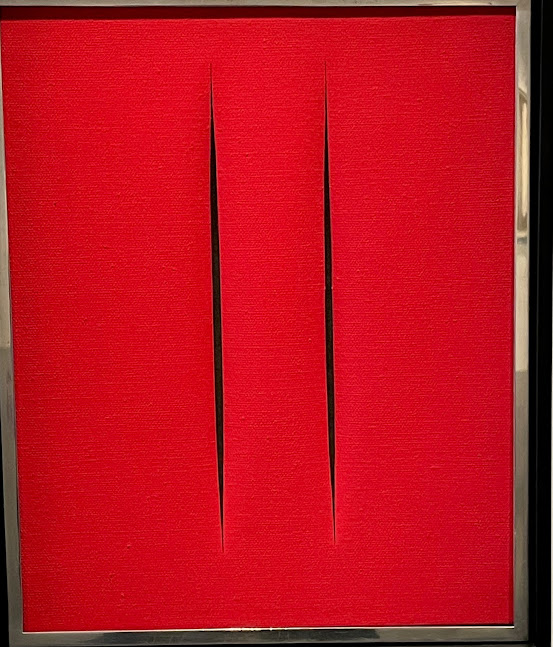 The gallery Nahmad Projects on Cork Street inn London`s Mayfair district (a blog with a cluster of galleries) has an exhibition called: "Luicio Fontana: I Tagli" (the show runs through July 22, 2022 nahmadprojects ). I could see some of his famous "slasher" paintings, which I also often spot at art auctions, and other works.
